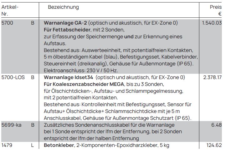 Eine Warnanlage für Abscheider ist ein wesentlicher Bestandteil moderner Abscheidertechnik und in der Regel gesetzlich vorgeschrieben, um einen sicheren und normgerechten Betrieb zu gewährleisten. Die Hauptaufgabe der Warnanlage ist die kontinuierliche Überwachung des Füllstands im Abscheider. Bei Erreichen eines Höchststandes der abgeschiedenen Flüssigkeit (Öl, Benzin, Fett) löst die Anlage einen Alarm aus.