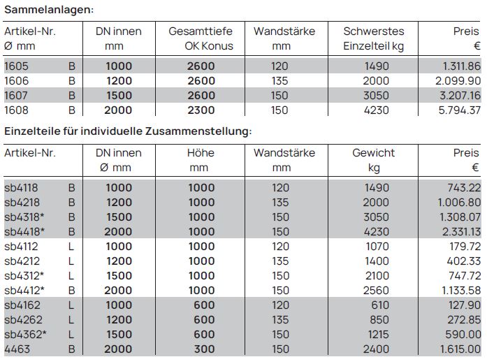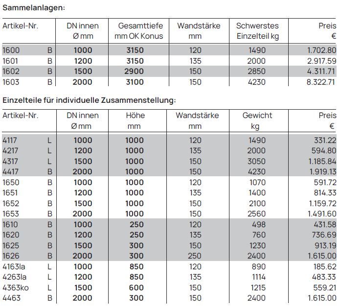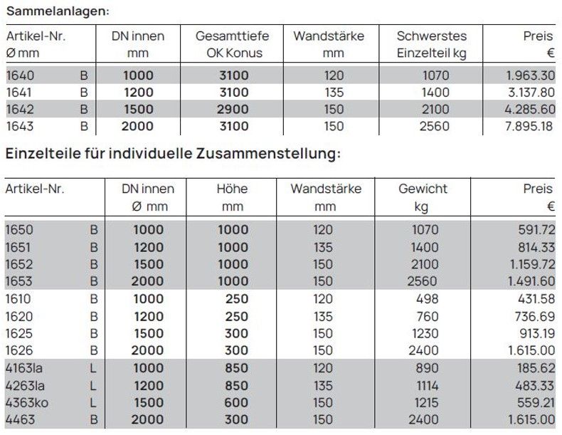 Schluck- und Sickerbrunnen für Wasser-Wasser-Wärmepumpen bestehend aus Schachtringen lt. Zeichnung für DN 1000 (analog DN 1200, DN 1500, DN 2000)