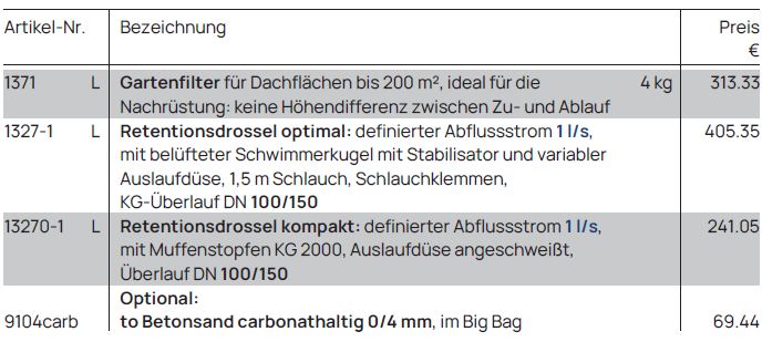 Passendes Zubehör für unsere Sicker-Zisternen „2 in 1“ finden Sie hier sowie auf Anfrage. Die Komponenten ermöglichen eine optimale Anpassung der Anlage an unterschiedliche Anforderungen bei Regenwasserversickerung, Retention und Filtration.