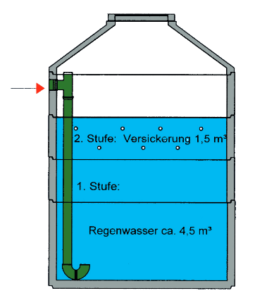 1. Stufe = Regenwassernutzung: Von Dachflächen gelangt Regenwasser über einen Filter und einen beruhigten Zulauf oder aber nur über einen beruhigten Zulauf in den Zisternen-Schacht und sammelt sich langsam steigend von unten nach oben.