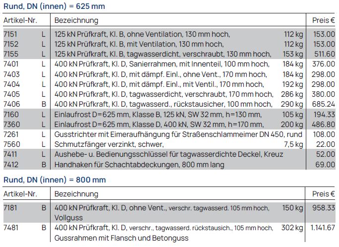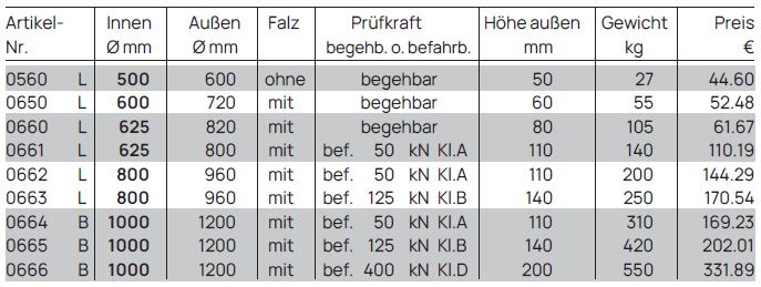 Diese sind je nach Durchmesser entweder begehbar, befahrbar bis 50 kN Kl. A oder befahrbar bis 125 kN Kl. B.