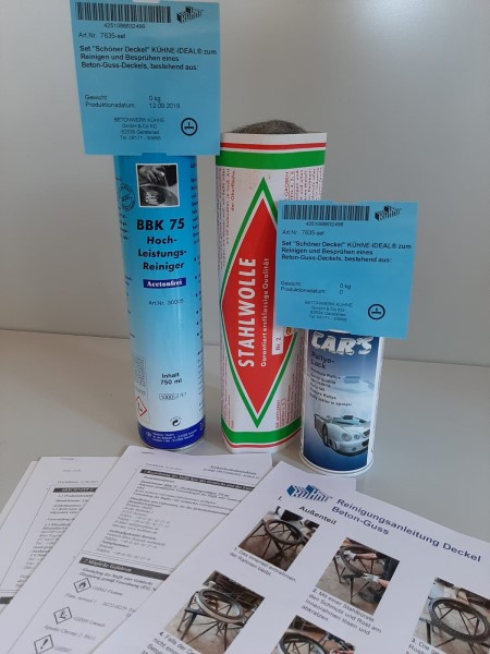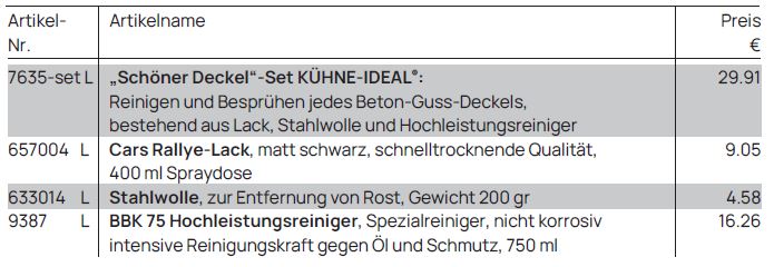 Mit unserem Zubehör für Schachtabdeckungen können Sie sämtliche Beton-Guss-Deckel reinigen und verschönern. Unser „Schöner Deckel“-Set KÜHNE-IDEAL® besteht aus: Cars Rallye-Lack, Stahlwolle und nicht korrosivem Hochleistungsreiniger.