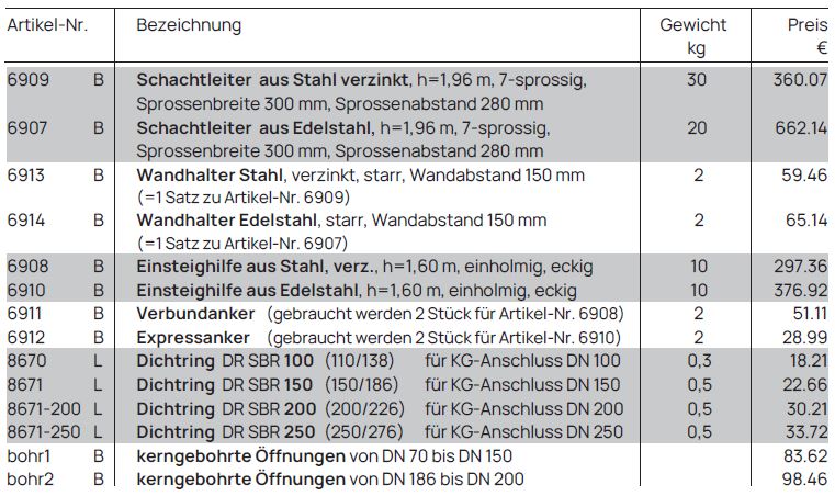 Auf dieser Seite finden Sie neben Gleitringdichtungen auch weitere Einbauartikel für den Tiefbau, darunter Schachtleitern, Einsteighilfen und weiteres Zubehör für den sicheren Einbau und Zugang zu Schachtbauwerken.