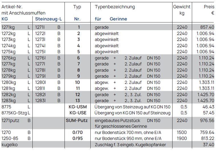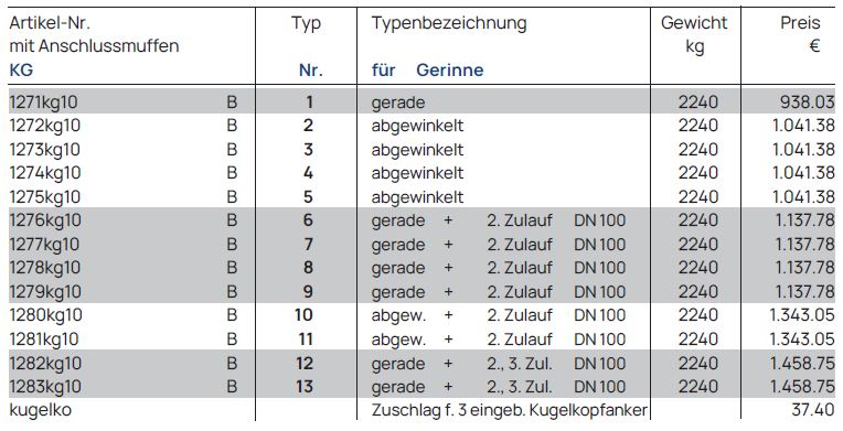 Gerinne DN 100, Bauhöhe 700 mm, Stzg.-Halbschale, Anschlüsse für KG, PP oder Steinzeug-L