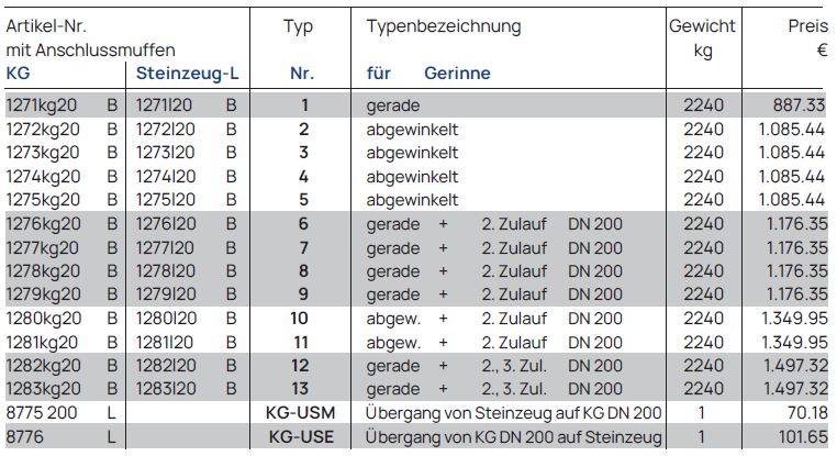 Gerinne DN 200, Bauhöhe 700 mm, Stzg.-Halbschale, Anschlüsse für KG oder PP