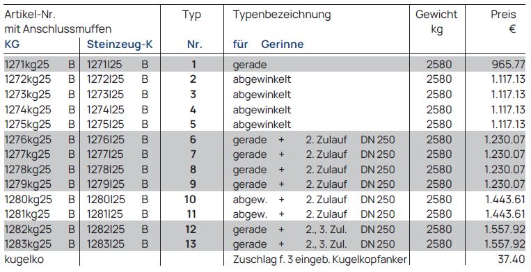 Gerinne DN 250, Bauhöhe 900 mm, Stzg.-Halbschale, Anschlüsse für KG, PP oder Steinzeug-K