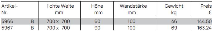 Der Höhenausgleich mit lichter Weite 700 × 700 mm ist zur Montage auf Kabelschacht-Übergangsplatten vorgesehen. Mit einer Bauhöhe von 60 mm oder 90 mm und einer Wandstärke von 100 mm ermöglicht er eine präzise Anpassung der Einbauhöhe und sorgt für eine passgenaue Ausführung der Schachtkonstruktion.