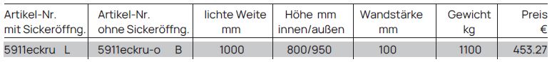 Der Kabelschacht eckig–rund KÜHNE-IDEAL® DN 1000 ist ein Unterteil mit Boden in der Abmessung 1000 × 1000 mm gemäß DIN 4034/2. Die lichte Innenhöhe beträgt 800 mm, die Außenhöhe 950 mm. Der Schacht ist für die Belastungsklasse BKL 60 ausgelegt und wird wahlweise mit oder ohne Sickeröffnung im Boden ausgeführt.