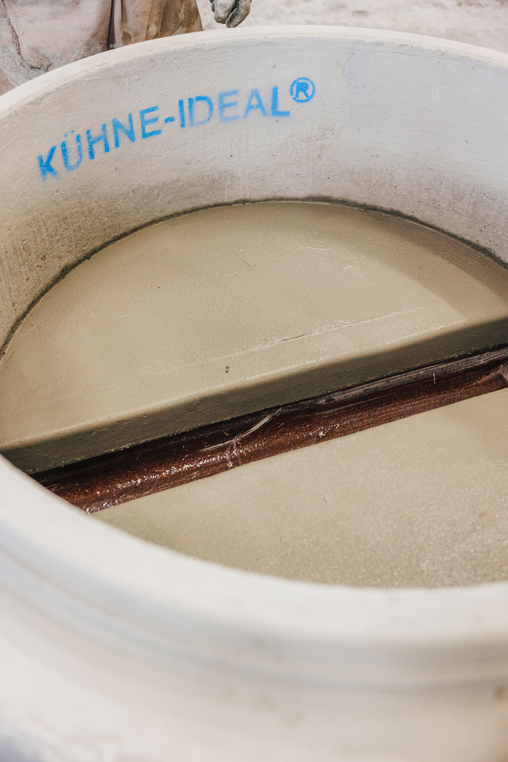 Besondere Bedeutung hat die handwerkliche Fertigung von unseren Schachtunterteilen KÜHNE-IDEAL®: die Gerinne aus Steinzeughalbschale werden präzise und in feinster Handarbeit in den Rohling eingearbeitet. Jedes Schachtunterteil ist ein Einzelstück und wird individuell an die geforderten Winkel und Neigungen produziert.